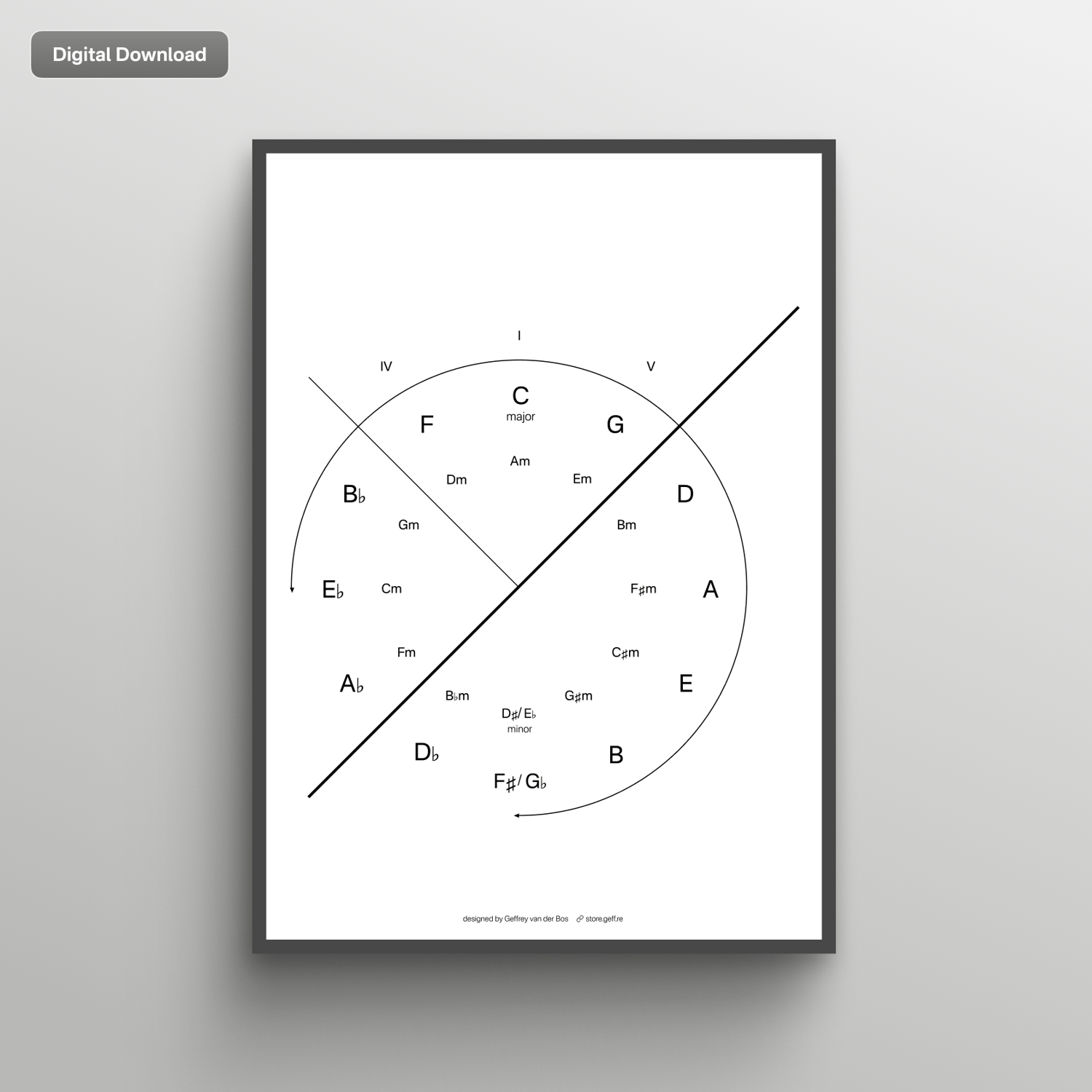 The Circle of Fifths minimal poster is designed for printing on A1 to A4 sized paper. Its clean, ink-saving design provides a straightforward reference to key signatures and harmonic relationships, making it a perfect addition to any music space. (You can also gift this to a musician friend on check-out!)